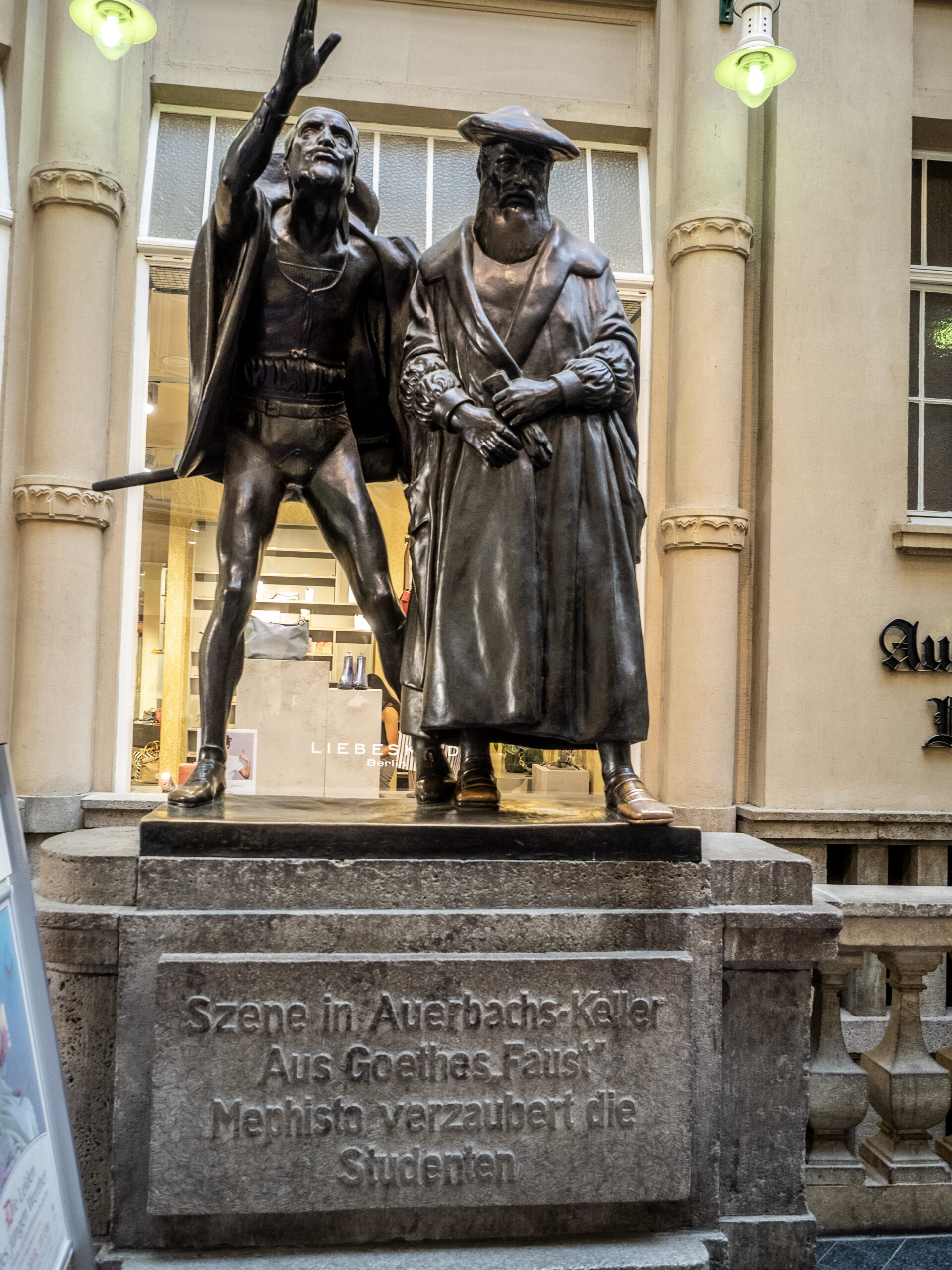 I solidaritet med Goethe, Bach og Mendelssohn Bartholdy lar jeg meg friste til et besøk i Auerbachs Keller, og etter å ha jobbet meg gjennom halvparten av min enorme porsjon Schweinehaxe mit Sauerkraut løfter jeg mitt skummende ølglass i en taus skål for Leipzigs store sønner.