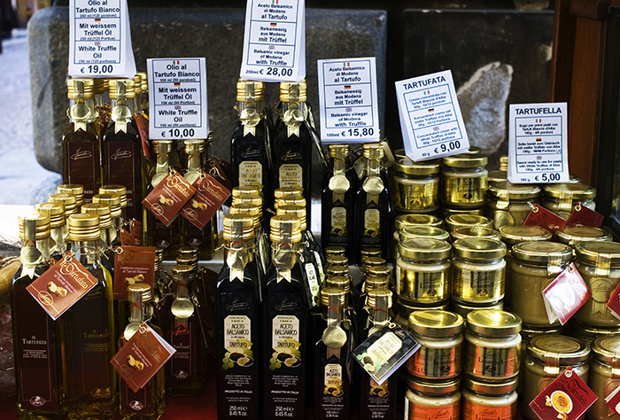 Når jeg går inn i hovedteltet på markedet, er luften tykk av uforlignelig rikdom. Ferske trøfler av ulike størrelser ligger i fløyelsforede kasser som dyrebare smykker, med prisetiketter festet som viser prisen per gram. Lokale innbyggere og besøkende menger seg med med kokker og rike restauratører som forhandler om premiumtrøfler. Lange rekker med boder viser produkter som trøffelsmør, trøffelpaté, trøffelolje og trøffelhonning.