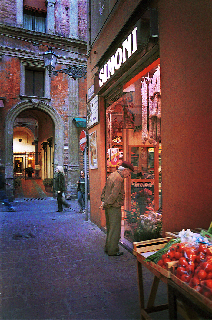 Det er en typisk lørdag ettermiddag på Mercato di Mezzo, et sjarmerende lite marked utenfor Bolognas Piazza Maggiore. I dette nettverket av gamle romerske gater, en gang hjemmet til byens håndverkere, er det mye liv og røre. Gamle menn deltar i animerte samtaler, kjærester spiser is sammen, bodselgere roper ut matkupp, og kunder samler seg rundt fisk, frukt, ost og kjøttboder. På restaurant/matbutikk Tamburini (Via Caprarie 1) ser utstillingen av matvarer ut som et kunstverk. Skinker og salamier i enhver tenkelig størrelse og form henger i vinduet ved siden av blokker av ost, brett med fargerik pasta og kurver med eksotiske sopper.