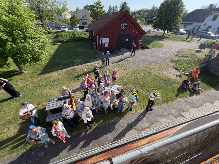 I god tid før vi nærmer oss kanalens eldste sluse ved det lille verkssamfunnet Forsvik, høres korsang i det fjerne. Fremme ved slusen finner vi en gruppe på 15-20 mennesker oppstilt ved slusekanten, som akkompagnert av hammondorgel og gitar lovpriser Herren i lett haltende, men åpenbart ektefølt korsang. Det viftes med tyske, danske, engelske, svenske og norske flagg – noen har tydeligvis fôret dem med passasjerlistene til «Juno».