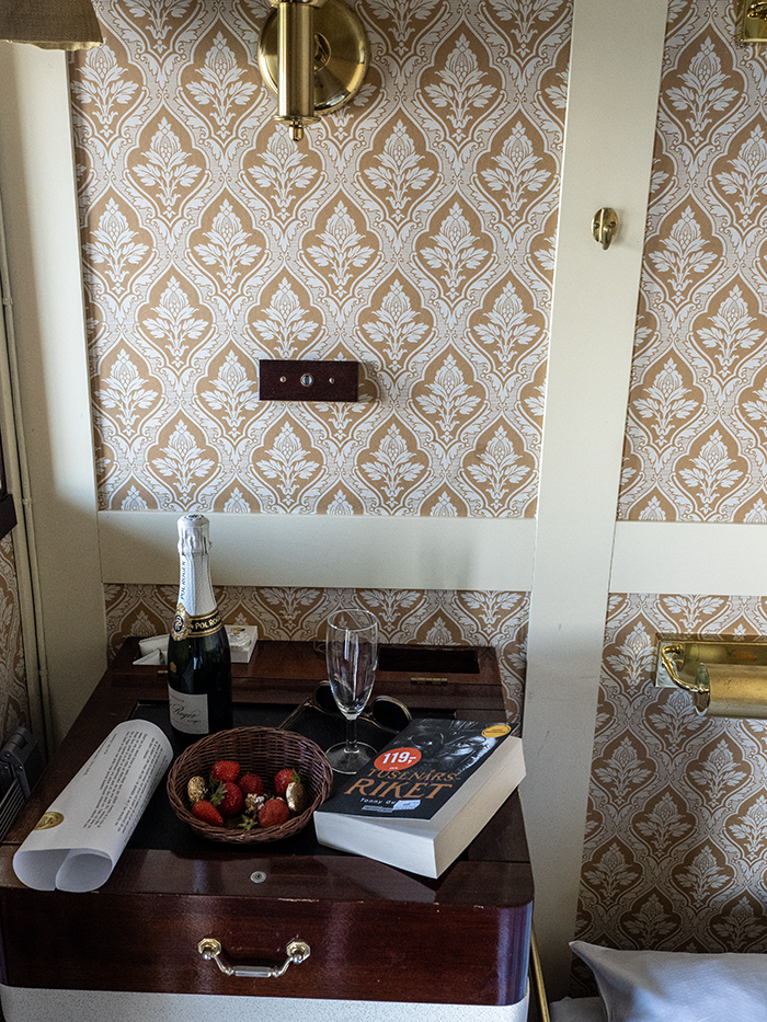 Om jeg ikke er alene ombord, er jeg heldigvis alene i lugaren. For det skal sies, at for 150 år siden var man ikke spesielt rause med arealet. Så jeg stabler meg sånn nogenlunde på plass med en litt for stor koffert for seks kvadratmeters tumleplass, og en køyeseng som opptar resten av lugaren. Jeg bruker kofferten som bord, sengen som avlastning/sofa og takker min skaper for at jeg reiser alene. Hvordan de mange parene på båten får plass, er meg en gåte…