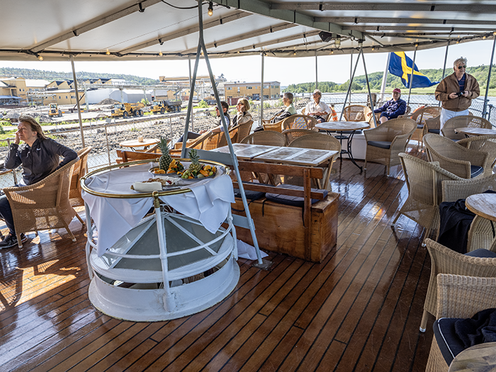 Jeg er ikke alene ombord, selvsagt. Et tyvetalls medpassasjerer samler seg gradvis og gruppevis under overbygningen på akterdekket, som raskt etableres som skipets sentrale samlingspunkt. Praten går på tysk, engelsk, dansk, norsk og selvsagt svensk. Den nølende forbrødringen begynner, godt hjulpet av en velkomstdrink og kaptein Annetts ønske om en behagelig reise.