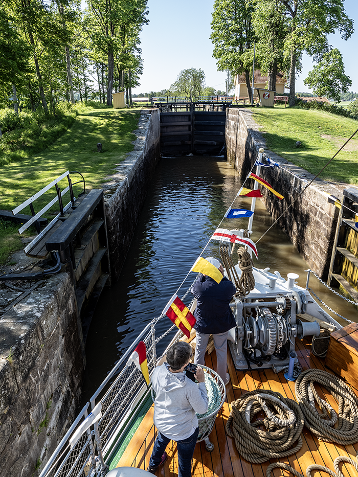 Snart når vi Ströms sluss ved Lilla Edet, den første av strekningens godt over 60 sluser. Den er også den eldste – opprinnelig bygget i 1607, gjenoppbygget etter krigen mot danskene i 1784 og endelig ferdigstilt i dagens versjon i 1916. Vi forskyver oss til baugen på «Juno», og knives gemyttlig om dekksplassen for de beste bildene. Inntil vi får viktigere ting fore: Det er tid for lunsj.