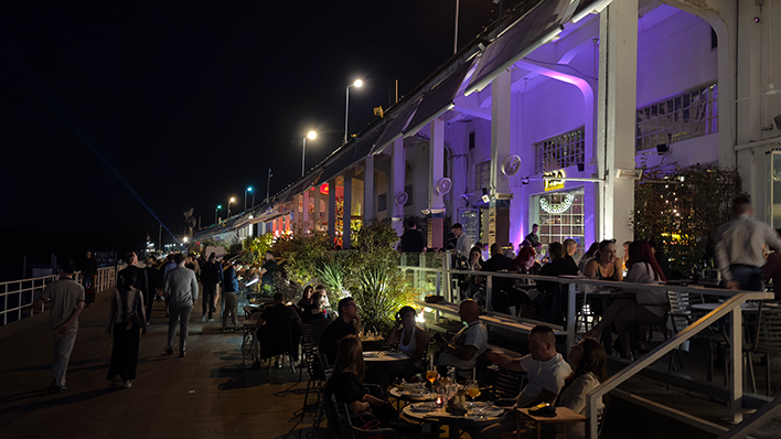 På dagtid er stemningen avslappet, med store terrasser og flott utsikt over elven og Nye Beograds skyline – perfekt for kaffe, lunsj eller en spasertur. Utvalget er bredt: sushi på Sakura, balkansk–mellomøstlig fusjon på Lavash, samt italienske, middelhavs- og steakhouse-restauranter side om side.