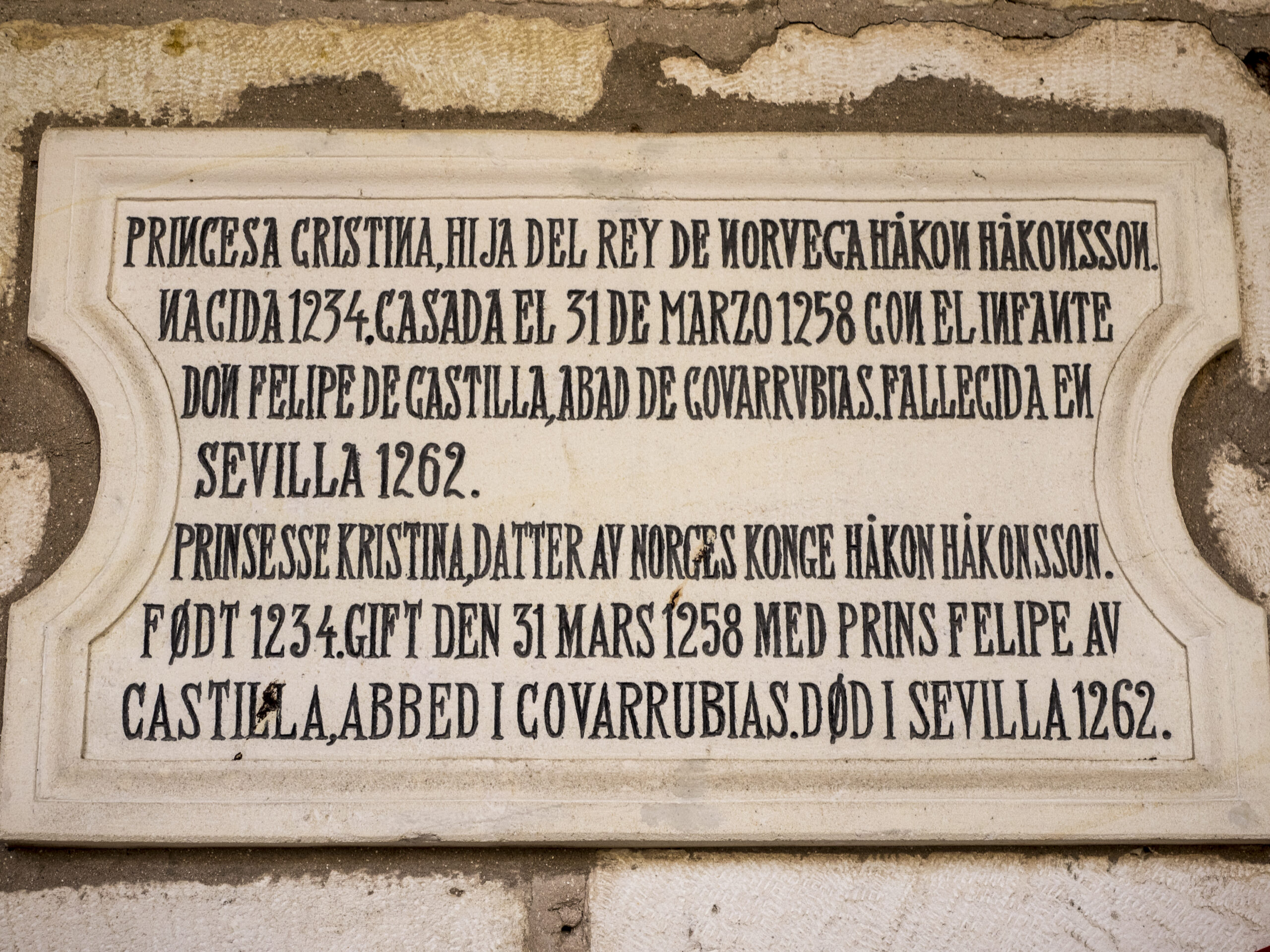 Kristina gjorde sitt valg blant brødrene, og den 31. mars 1258 ble hun viet til Don Felipe i Castillas viktigste kirkebygg, Santa Maria Major. Bryllupsreisen gikk til nettopp Covarrubias, før de nygifte etter hvert slo seg ned i Sevilla. Historien forteller at de to da var blitt svært forelsket i hverandre, og her vi står ved sarkofagen 760 år senere ønsker vi virkelig at det var sant.
