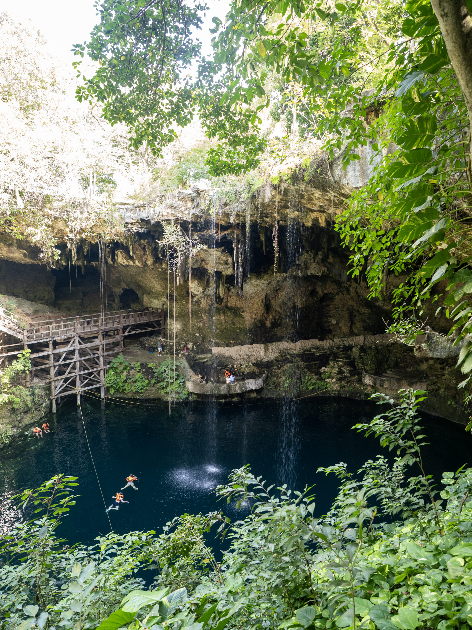 Zakí er en av de største cenotene i området – en underjordisk eventyrverden opplyst fra hullet i taket, med klart blågrønt vann som er mellom 30 og 100 meter dypt. Hit kommer turister i hopetall for å gjøre noe så sjeldent som å bade i en cenote, med påbudt svømmevest. Og etter å ha betalt våre inngangsbilletter i anlegget (som også huser et marked og en restaurant), hopper vi ut i vannet og lar vi oss flyte rundt i det naturlige «svømmebassenget» med en diameter på 45 meter.