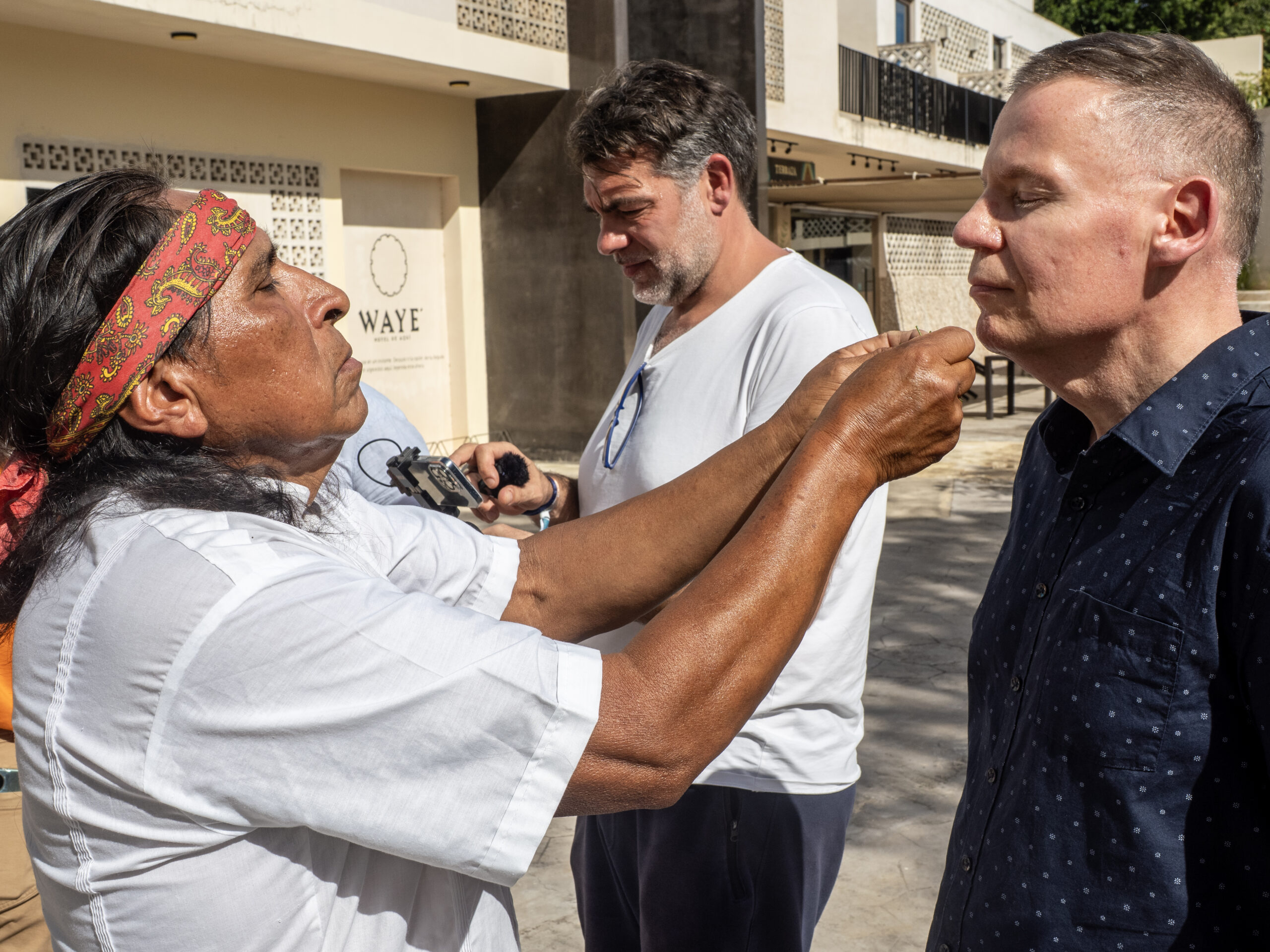 På utsiden treffer vi maya-shamanen Carlos Nabke, som har rigget til en plass med lys, røkelse, diverse krydderurter, samt noe som ser ut som bjørkeris. Vi stiller oss i en halvsirkel, og Carlos henvender seg til hver enkelt av oss. Han snakker et språk vi ikke forstår, men vi skjønner likevel at han vil vite om vi har noe som plager oss. Kanskje en vond rygg, et svakt hjerte eller hodepine. Han berører de angitte områdene på kroppen, mens han messer og slår forsiktig med «bjørkeriset» på hver skulder – ikke ulikt ritualet i en finsk sauna.