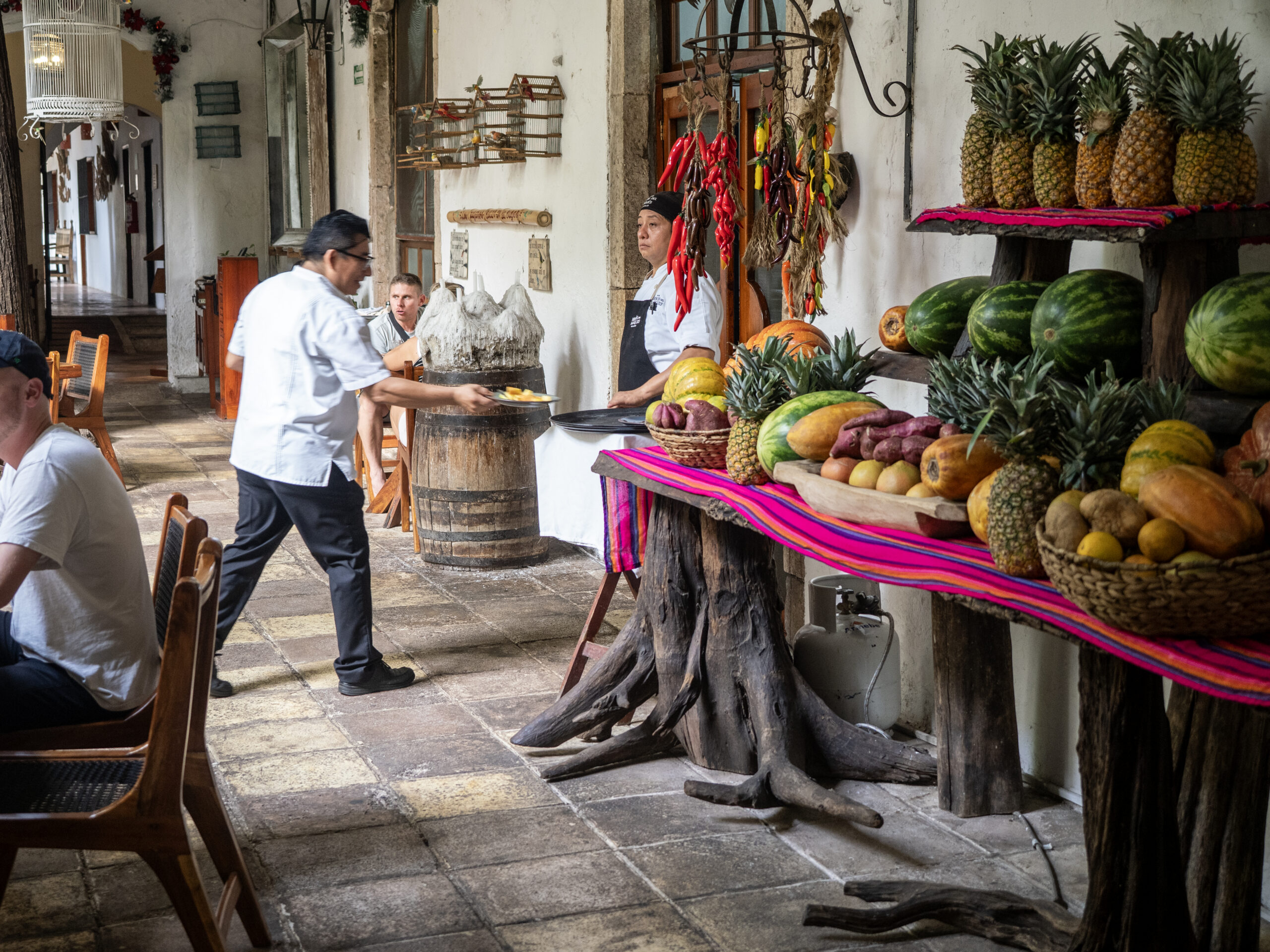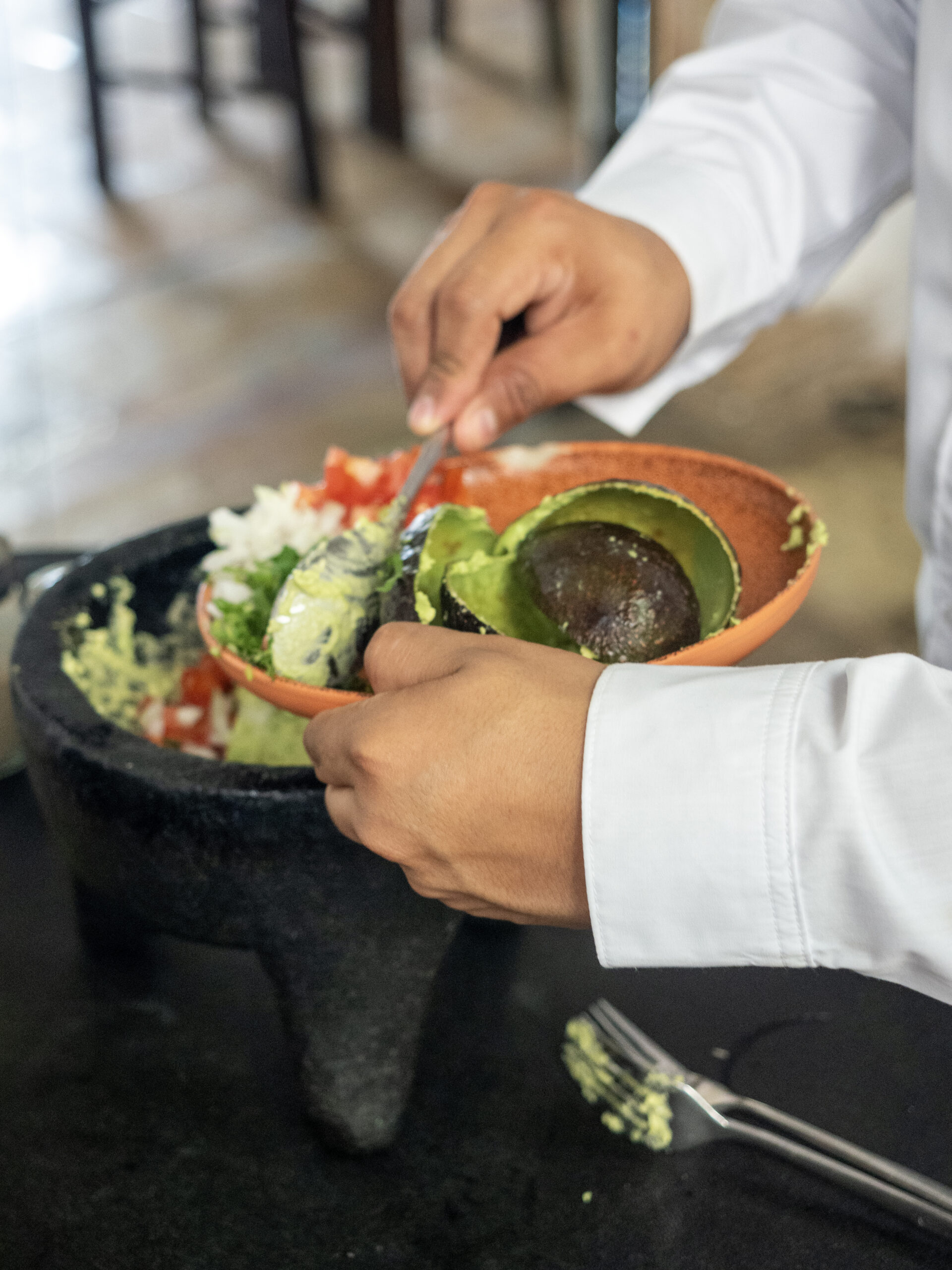 Vi booker oss inn på Hacienda el Mortero i Cancun, som serverer tradisjonell mexicansk mat fra øverste hylle. Med fullt mariachi-band i vakre tradisjonelle kostymer høylydt tilstede mellom de forskjellige bordene i lokalet, skulle man kanskje tro at dette er en regelrett turistfelle. Et blikk på bordene rundt oss legger antagelsen død: Her er lokale familier ute og feirer en spesiell anledning, grupper av venner hygger seg sammen en fredagskveld, og alle – unntatt vi – er på fornavn med kelnerne. Som i likhet med andre kelnere vi treffer på ulike spisesteder her, går med hårnett. Kjekt det, så slipper du hår i tacoen.